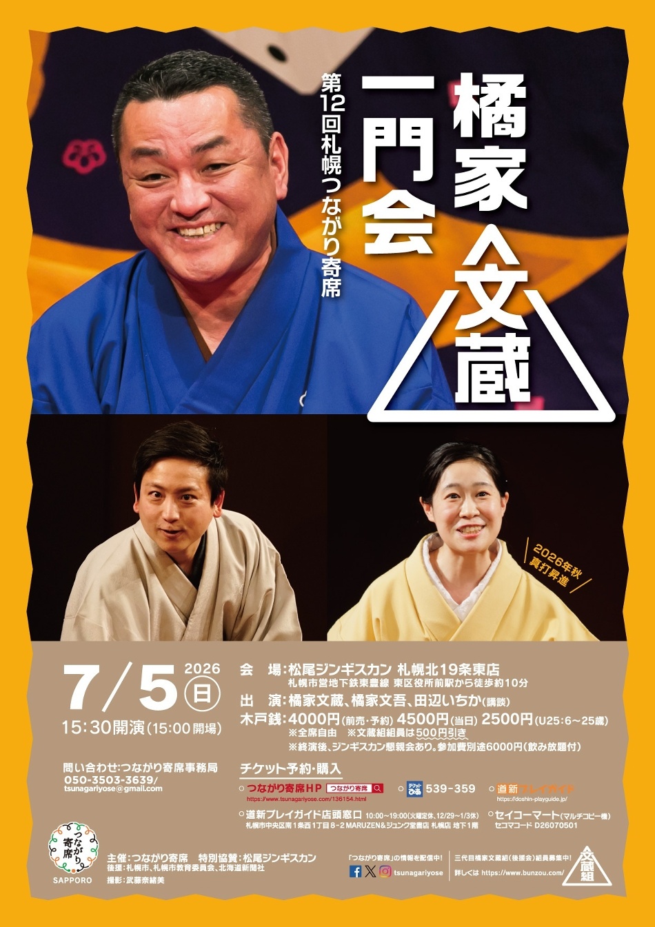 第12回札幌つながり寄席を松尾ジンギスカン札幌北19条東店(2階大広間)にて開催します。 出演は落語協会所属の真打・橘家文蔵師匠、一番弟子の二ツ目・橘家文吾さん、 そして2026年秋に真打昇進が決まっている講談師の田辺いちかさんです。 終演後は美味しいジンギスカンを囲んで出演者を交えての懇親会も開催いたします。 おひとり様でも楽しめますので、お気軽にご来場ください!