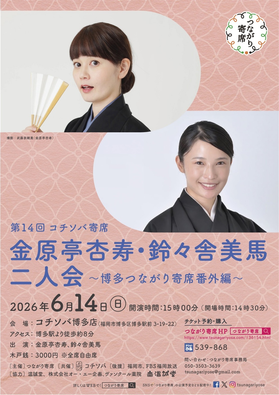 コチソバ博多店で開催する「第14回コチソバ寄席」は、期待の若手おふたりをお迎えします。